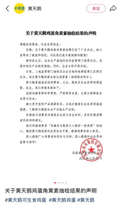 3月16日,黄天鹅发布角黄素抽检成果声明并附检测演讲。敏捷对相关产物组织抽检,目前。